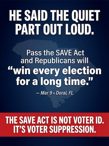 But the SAVE America Act is not a common-sense measure. It is a voter suppression scam — designed not to protect elections, but just one of many Republican attempts to rig them.