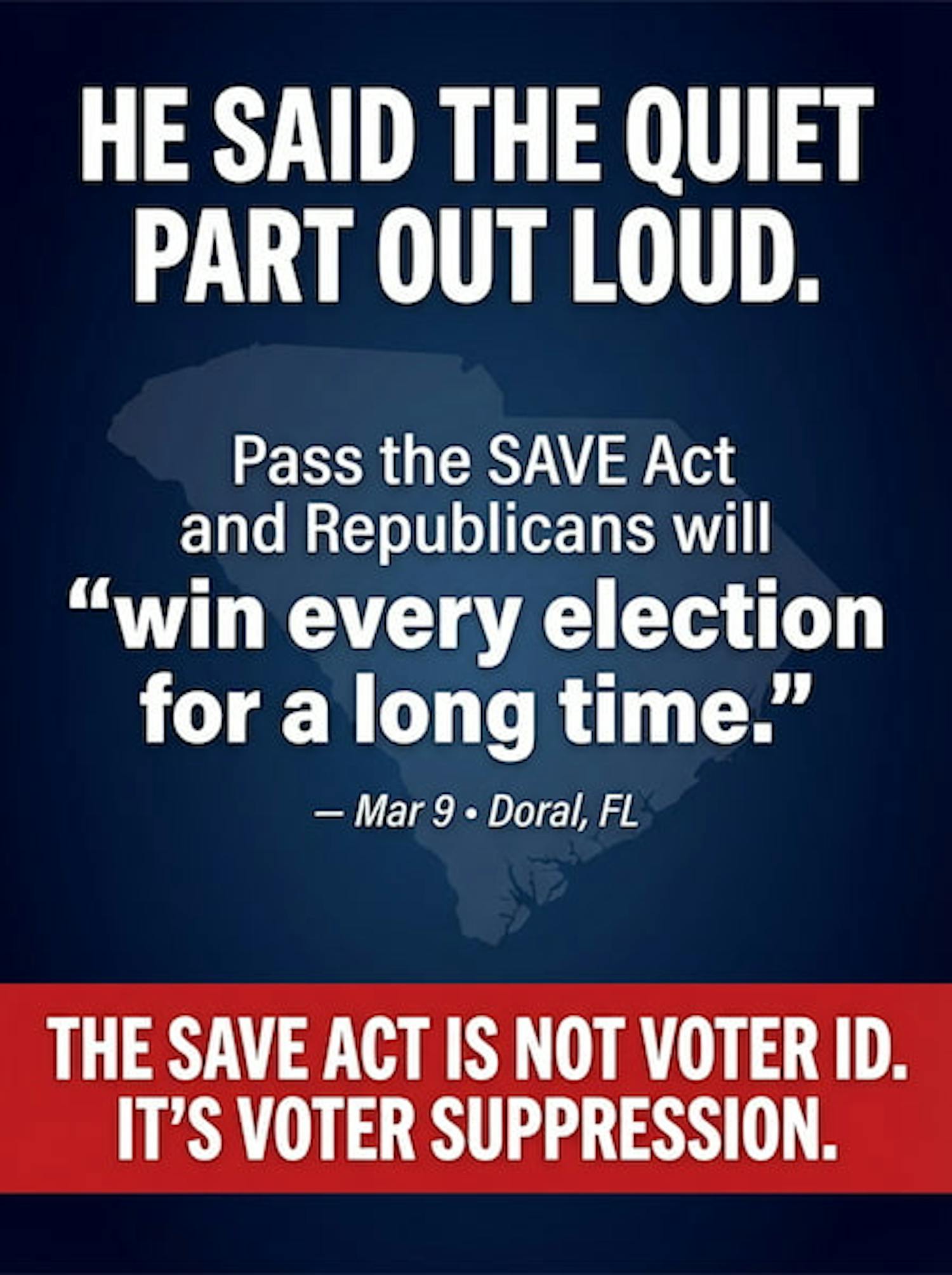 2. Russell Fry is not a bystander. He is a participant. He voted for the SAVE Act. He promoted it on Facebook after it stalled in the Senate. He is signaling to Trump and to his party that he is on board with the plan — not representing the voters of SC-7.